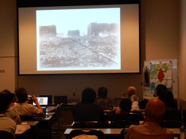 | 清野さん(被曝遺構保存を推進する会)による講演 | 太田先生による「国際地図学会」報告 | 原田先生(立正大学)による「聞き書きマップ」の説明 | 奥本博さんによる被爆体験 |
