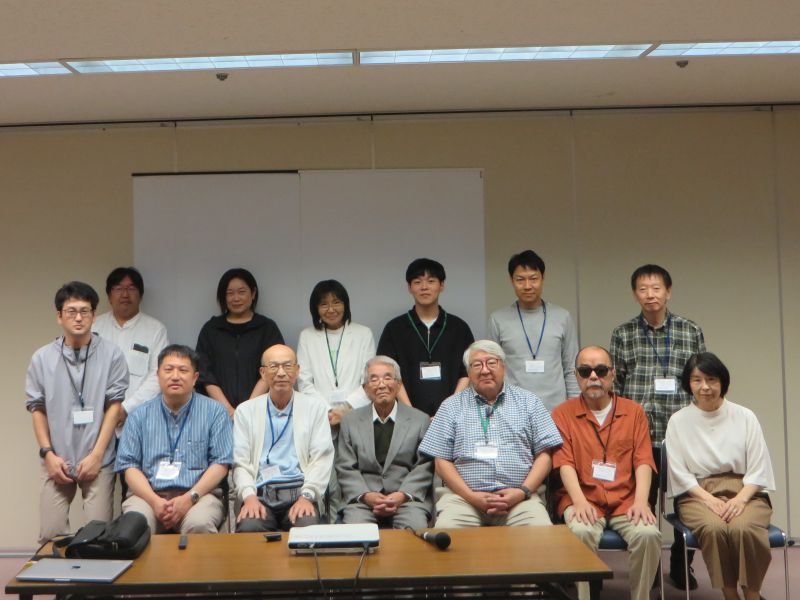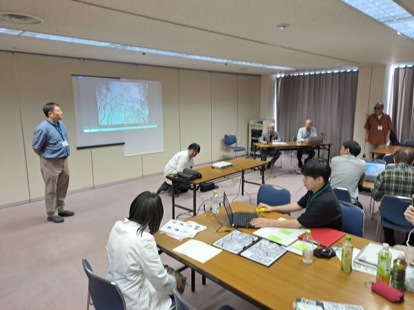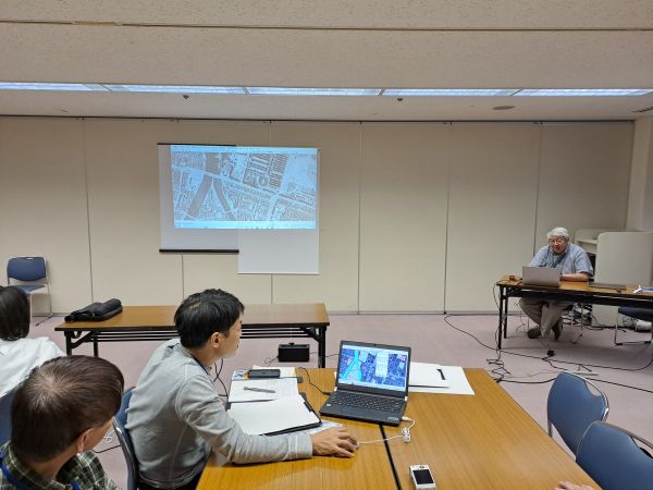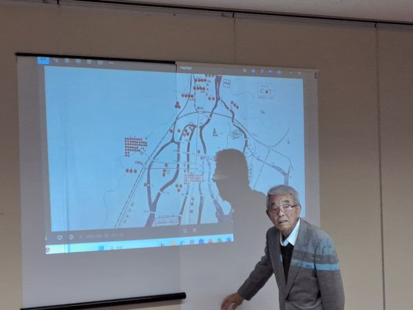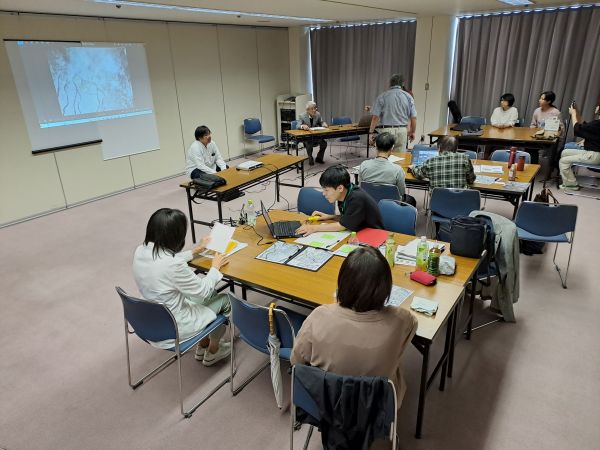 | 午後からは室内に会場を移してグループワーク | 太田先生による「地図太郎」の使い方説明 | 川瀬先生(広島修道大学)によるあいさつ | 竹崎静嘉さんによる 被爆体験のお話 |